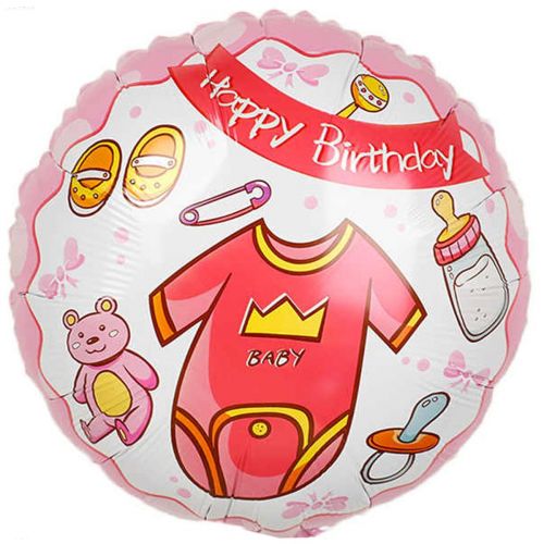 Фольгированный шарик круглой формы розового цвета с изображением пижамы, соски, памперсов и других атрибутов малыша. Подойдет как для выписки из роддома, так и на День Рождения малыша. Размер — 46см. Объем шара: 0,011 м. куб.