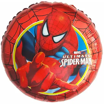 Фольгированный шар в форме круга с изображением Спайдермена (Человека-паука) — супергероя из комиксов и фильмов Марвел. Произведен в Китае. Имеет встроенный клапан, что упрощает надувание. Диаметр — 18″ (46 см). Объем шара: 0,014 м. куб.
